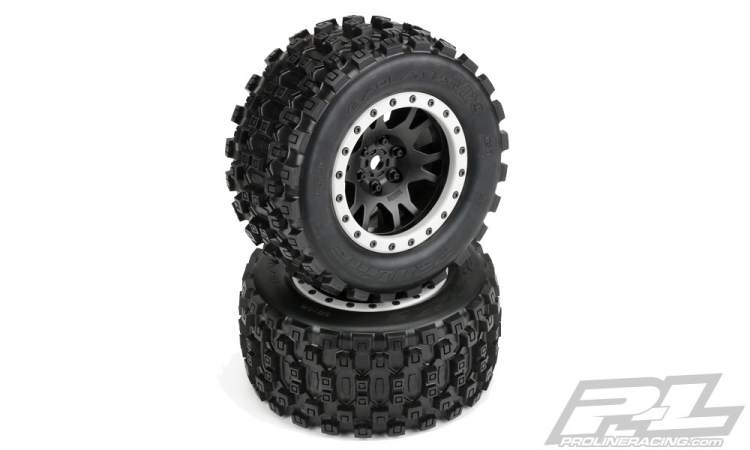 Badlands MX43 Pro-Loc All Terrain Däck för X-MAXX fram eller bak, monterade på Impulse Pro-Loc svarta fälgar med stengrå Beadlock-ringar.