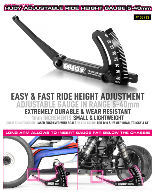 Fullt justerbar professionell åkhöjdsmätare för enkel och snabb åkhöjdsjustering i steg om 1° i ett totalt område på 5-40 mm.