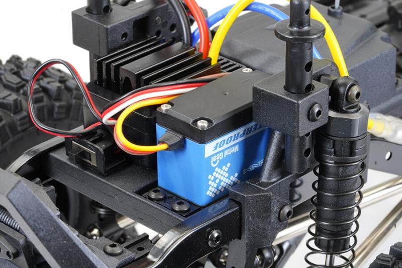 En Etronix 15 kg metalldrevs servo och servoarm tar nu på sig den tunga styrningen. 6 mm stållänkar har ökad böjvinkel för bättre frigång över stenar och en ny monteringspunkt för axellänkar i aluminium ger styrka.