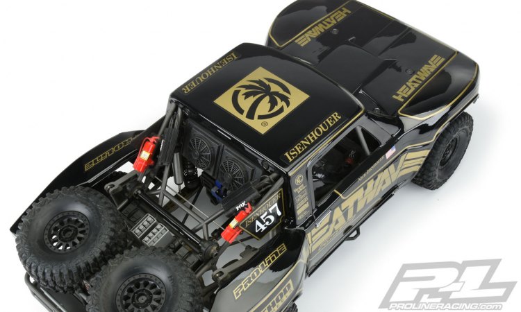 This is the 1967 Ford® F-100 Race Truck Heatwave® Edition Tough-Color (Black) Body for the Unlimited Desert Racer®. Now you can build a fully licensed replica of the popular full-size Heatwave® Trophy Truck driven by Chris Isenhouer! Chris races his iconic Black and Gold Heatwave® Ford® F-100 converted to Trophy Truck specs in the unrelenting desert along with his brother Nick. Pro-Line is proud to bring Chris’ truck to life for your Traxxas® UDR® made from Pre-Cut Tough-Color Black Polycarbonate. The massive Black and Gold Heatwave® decal wrap is also included and pre-cut for easy installation. The body features the iconic flat front F-100 grill and wide fender flares to represent the aggressive fiberglass bulges found on Chris's full-size race truck. Pro-Line's 1967 F-100 Heatwave® Edition body mounts directly to the cage on the UDR® in the same locations as the stock body, so all you need to do is remove the outer film, place the wrap following the included instructions, and install the body just like you would the stock body. Transform the look of your Unlimited Desert Racer® and add even more scale realism with the fully licensed 1967 Ford® F-100 Race Truck Heatwave® Edition Body from Pro-Line!