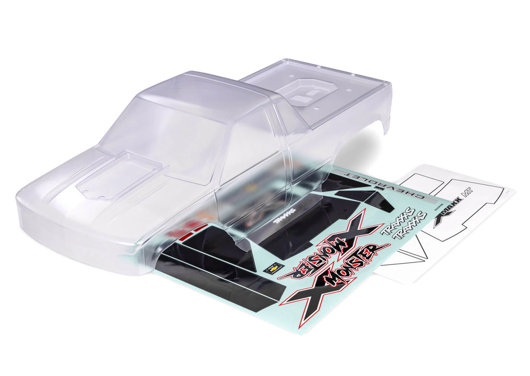 Den klara X-Monster Chevrolet® GMT400 CK truck-karossen levereras färdigtrimmad och redo för målning, med dekalklistermärken, fönstermaskering och förapplicerad skyddsfilm mot överspray. Inkluderar innerbur, klipplösa karossfästen, karossförstärkningar samt monteringsdetaljer.
