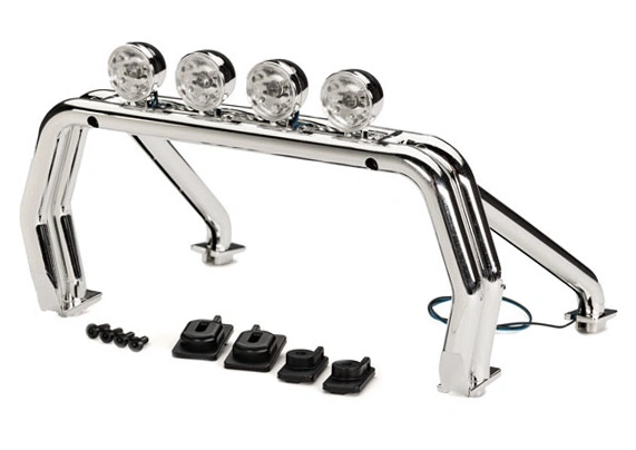 Add more scale detail to your TRX-4® Chevrolet® K10 or Ford® F-150® pickup body with this chrome roll bar with working LED lights. Includes left and right mounts and 2.6 mm screws (4). (requires 9212-series K10 or 8230-series F-150 body with LED light kit installed)