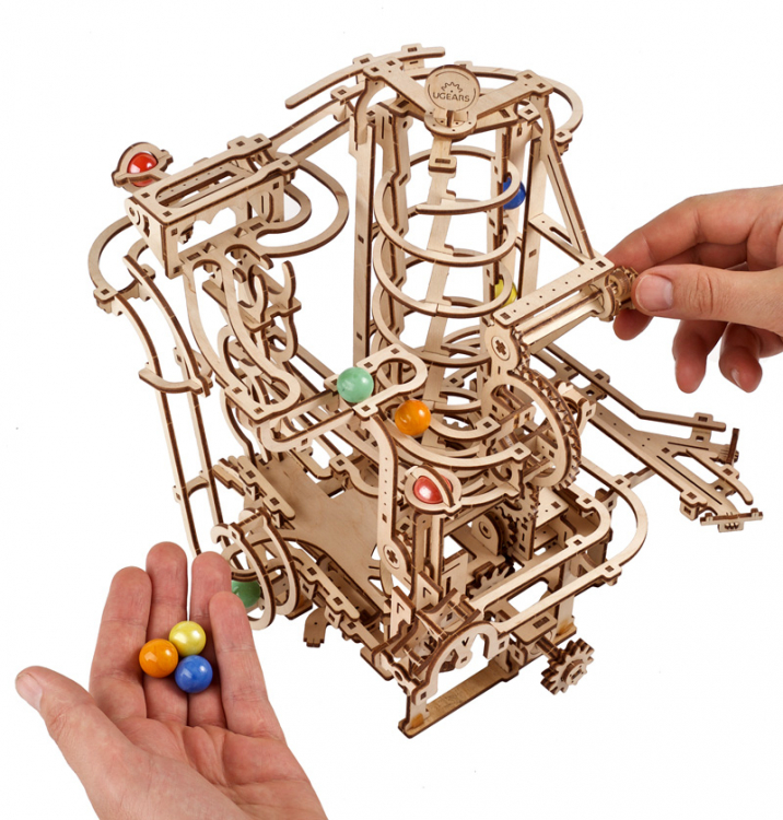 Marble Run Spiral Hoist är den fjärde modellen i Ugears samling av fascinerande DIY mekaniska marmorlöpar. Lyften har två typer av skenor för att påskynda uppstigningen: huvudspiralskenorna och vertikala skenor. Vrid veven för att lyfta de färgade glaskulorna uppåt (en kula stiger per nio varv av lindningsveven) till förvaringen med tre marmor uppåt. Därifrån börjar kulorna sina nedförsbackar genom spännande element: en höghastighetsrutschkana, en vertikal orm och en bergsflod.
