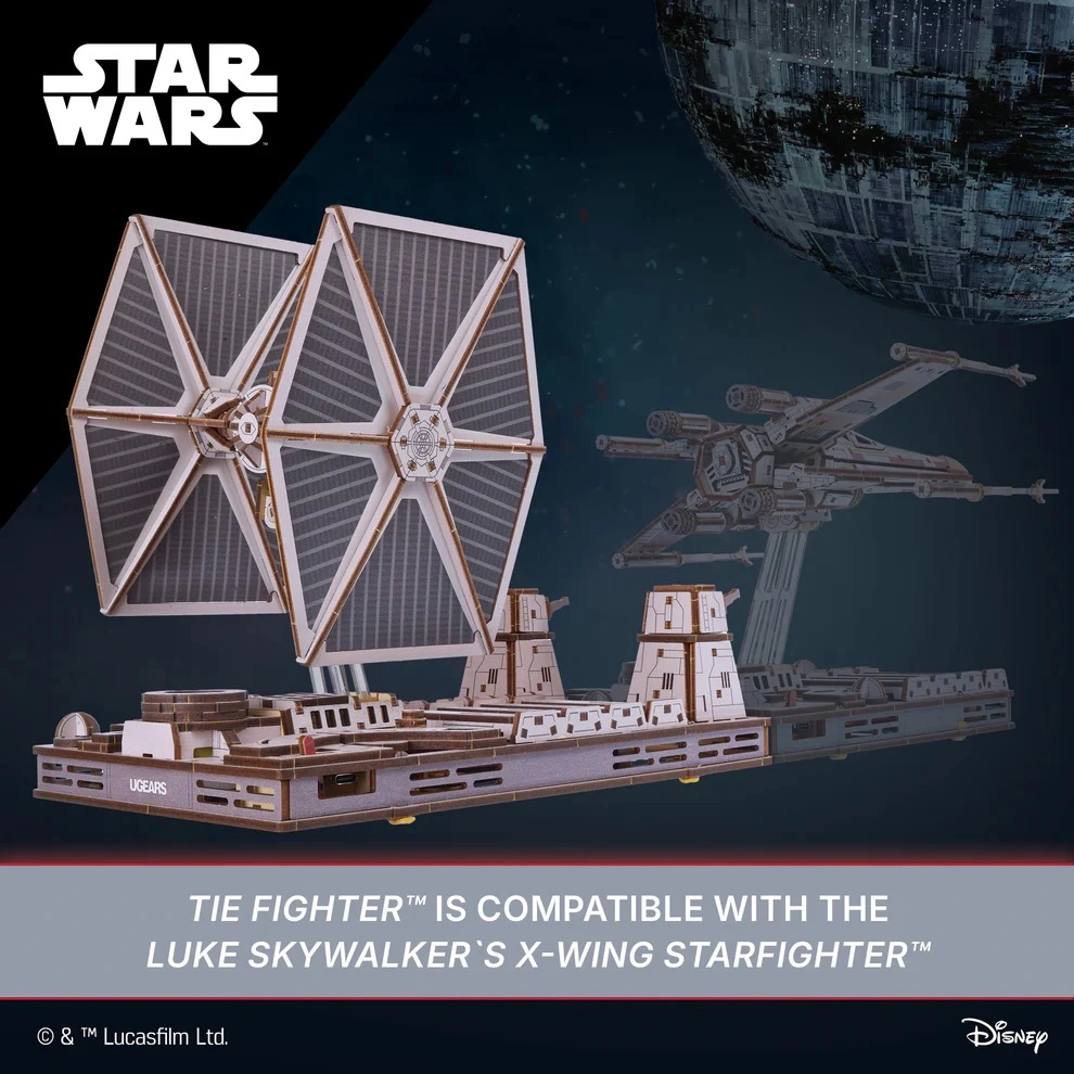 Feel like joining the dark side and becoming Lord Vader's wingman as you build and fly the Star Wars™ TIE Fighter™ spaceship from the licensed Star Wars™ collection by Ugears. The Twin Ion Engine or TIE Fighter, with its ball cockpit and hexagonal wings, is the iconic starfighter of the Galactic Empire. Agile yet vulnerable, the TIE Fighter is a feared and formidable foe, whether in dogfights or providing close air support against ground-based rebel forces.