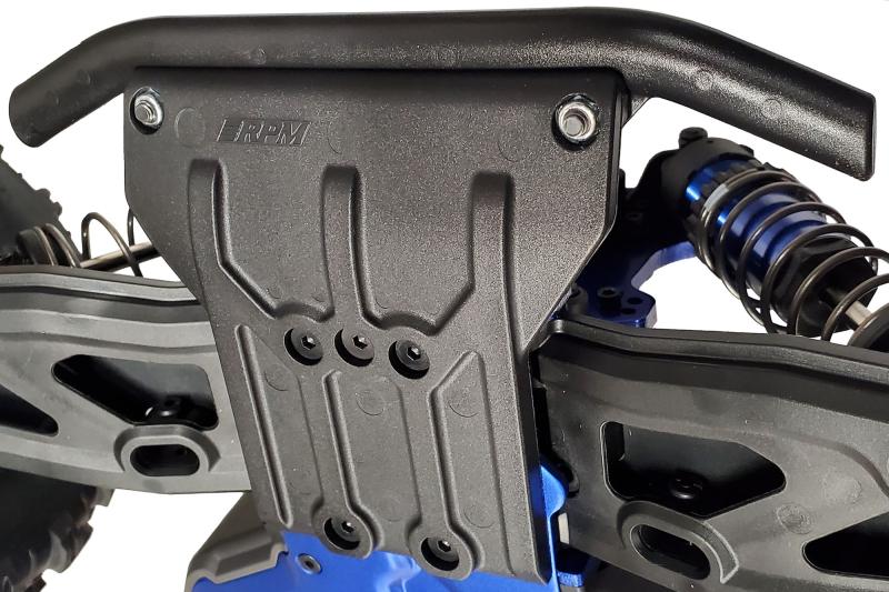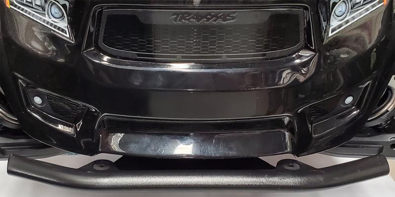 Först tog RPM bort original stötfångaren och ersatte den med en bärarmsaxelhållare, eftersom realistiskt sett är det allt vad original stötfångaren egentligen är. Därefter eliminerade RPM original slitplattan till förmån för en bredare, längre och mer skyddande slitplatta. Till sist skruvade RPM fast en unik stötfångare på framsidan av slitplattan. RPM främre stötfångaren och slitplattan för Traxxas Sledge sitter under karossen, vilket tillåter karossmonteringssystemet fullt rörelseomfång, men Sledge har äntligen ett tufft RPM frontskydd.