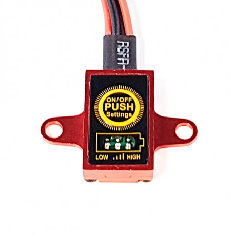 a) Varnar vid låg spänning, LED-indikator visar batterispänningsnivå , 3 typer av batteri typer kan användas (LiPo, LiFe, NiMH-batteri)