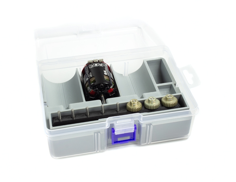Denna praktiska låda förvarar 3 motorer i skala 1/10 och har 3 praktiska fack för saker som drev, sensorkabel och motorlager.