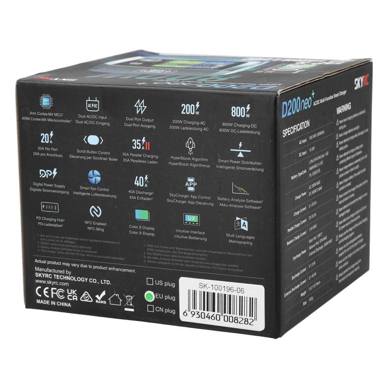 Tack vare sina två oberoende ingångar kan laddaren användas för olika laddningssituationer. Den har också ett särskilt användarvänligt gränssnitt och kraftfulla funktioner som antogs direkt från T1000. Till exempel kan BD350-urladdningsenheten anslutas för att avsevärt öka urladdningsprestandan. Det nya utseendet och förbättrade rullningsknappkontrollen gör laddningen bekvämare och enklare överlag. Naturligtvis är D200 neo också utrustad med "SkyCharger"-appkontroll och ett gränssnitt för Charger Master-mjukvaran för Windows/Mac OS, vilket ger större frihet i programmering och detaljerad information under laddning eller urladdning.