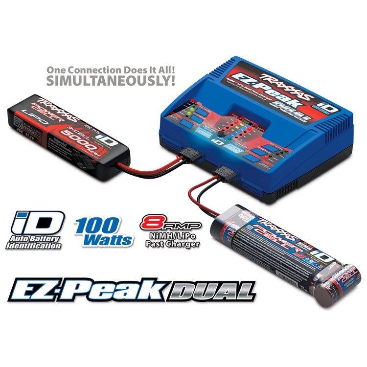 Charging Solved! Simple. Fast. Just plug in a pair of Traxxas iD batteries and press Start. Traxxas’ exclusive iD technology eliminates complicated charger programming by automatically configuring and optimizing the charge settings for Traxxas iD batteries. The EZ-Peak Dual charges two batteries simultaneously at up to 50 watts (4-amps) each, or switch to High-Output mode to charge a single battery at the maximum 100 watt (8-amps) output. Charging faster means more fun time behind the wheel. You can even charge a NiMH and a LiPo at the same time! The progress bar and audible alerts keep you informed while the advanced high resolution peak detection delivers a perfect charge every time. The EZ-Peak Dual’s Storage Mode protects your LiPo battery investment by safely preparing the batteries for extended storage.