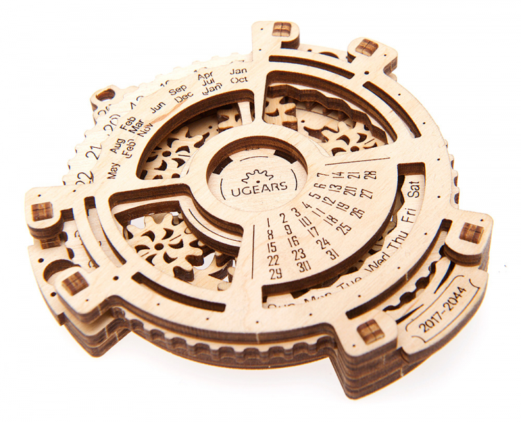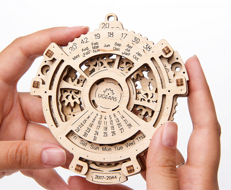 Date Navigator hjälper till att identifiera veckodagen för alla datum från 2017 till 2044. Den är monterad utan lim som alla UGEARS-modeller.