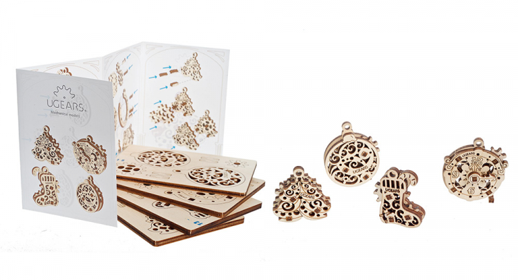 Den unika uppsättningen med fyra individuella miniatyrmodeller för självmontering för vuxna och barn från 5 år till 80 år och uppåt. Satsen innehåller strumpa, julgran, klocka, julbollstrumpa. Varje modell har grundläggande element i mekanik.