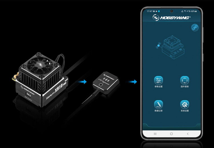 Simple and convenient, parameter settings, firmware upgrading and other operations can be established using Hobbywing’s OTA Bluetooth module and your mobile phone via the Hobbywing app.
